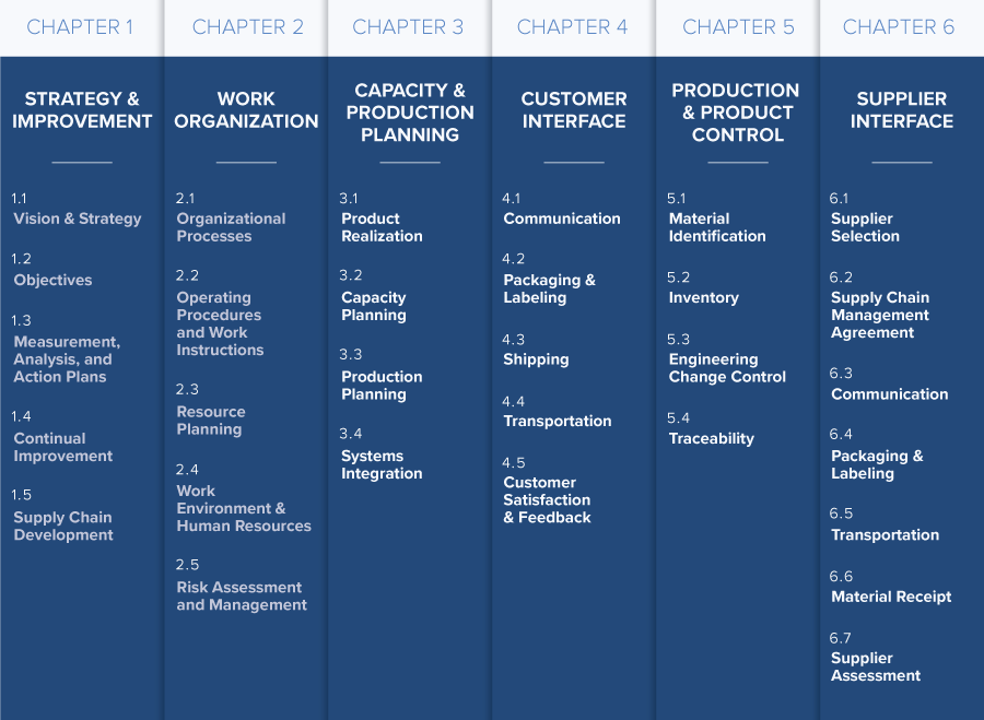 La Guía de Operaciones de Gestión de Materiales/Evaluación Logística de AIAG/Odette (MMOG/LE) proporciona a las organizaciones un sistema de gestión de la cadena de suministro. La primera versión de la evaluación MMOG/LE se introdujo en 2004 y hoy se encuentra en su quinta revisión. El siguiente es el contenido de los seis capítulos de MMOG/LE (véase Figura 1).
