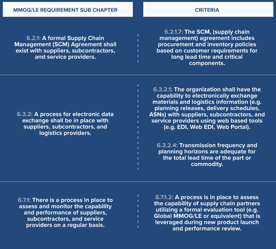 En la versión más reciente de MMOG/LE, se agregó el criterio 6.2.1.7 (véase Figura 2), en respuesta a la escasez y las disrupciones que ocurrieron en 2008-2009. Además de 6.2.1.7, el Capítulo 6 Interfaz del proveedor recomienda que se implementen y documenten los siguientes requisitos adicionales en un proceso: