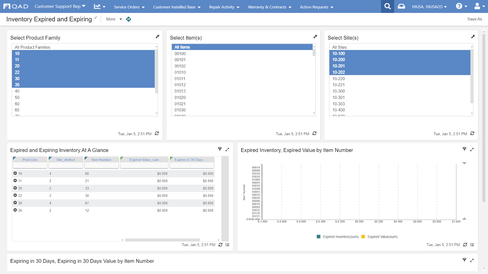 เห็นได้ชัดเจนว่าผู้ผลิตที่ใช้ QAD Adaptive ERP มีข้อได้เปรียบเหนือบริษัทอื่นๆ ที่ต้องรับมือกับความเป็นจริงของอายุการเก็บรักษาและการหมดอายุของสินค้าคงคลัง เนื่องจาก QAD Adaptive ERP มีความสามารถในการติดตามและตรวจสอบการหมดอายุที่กำลังจะเกิดขึ้น เพื่อให้บริษัทสามารถวางแผนดำเนินการก่อนที่สินค้าเหล่านั้นจะหมดอายุ ทั้งนี้ Actionable insights ด้านสินค้าคงคลังที่หมดอายุและกำลังจะหมดอายุถือเป็นเครื่องมือที่มีประโยชน์สำหรับการติดตามให้ผู้ใช้สามารถเลือกผลลัพธ์ตามกลุ่มผลิตภัณฑ์ สินค้าเฉพาะ หรือไซต์เฉพาะ อย่างไรก็ดีสำหรับภาพรวมทั้งหมดที่กล่าวถึงด้านล่าง จะช่วยให้นักวางแผนสินค้าคงคลัง ผู้ซื้อ และผู้จัดการสามารถมุ่งเน้นไปที่สินค้าคงคลังที่เฉพาะเจาะจงหรือสินค้าที่แต่ละตัวได้อย่างถูกต้องแม่นยำ
