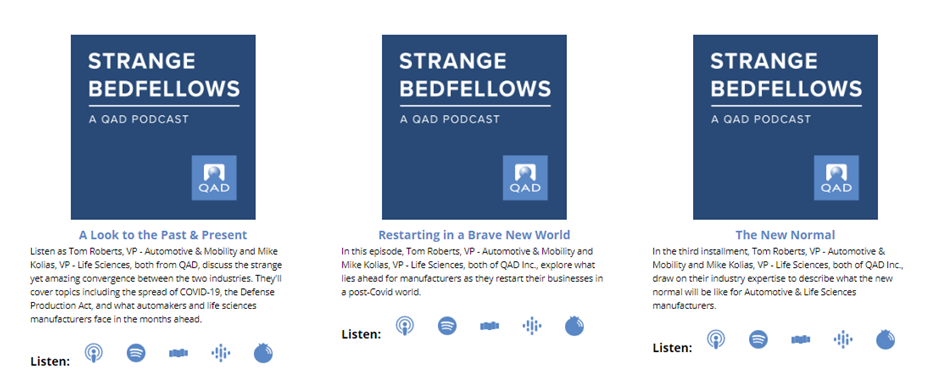 QAD ได้เริ่มทำ Podcast ตั้งแต่เกิดวิกฤต COVID-19 เนื่องจากสังเกตเห็นแนวโน้มใหม่ระหว่าง 2 อุตสาหกรรมยานยนต์และวิทยาศาสตร์เพื่อชีวิต ที่จะเล่าถึงช่วงเวลาของความท้าทายที่เกิดขึ้นไม่ว่าจะเป็นด้านสภาพแวดล้อมการผลิตทั่วโลก ข้อกำหนดของรัฐบาล สังคม การหยุดชะงักของคำสั่งซื้อในกระบวนการผลิต รวมไปถึงแนวทางปฏิบัติที่ดีที่สุดสำหรับอุตสาหกรรม ในรูปแบบย่อที่เข้าใจง่าย เพื่อช่วยให้อุตสาหกรรมผลิตสามารถรับมือและดำเนินงานต่อไปได้อย่างมีประสิทธิภาพ
